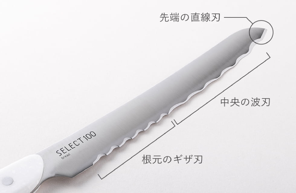 先端に2cmほどの直線刃が付いています。この刃をまな板に押し当てるようにして切ると、バゲットや食パンの外側の皮を残さずにきれいに切ることができます。