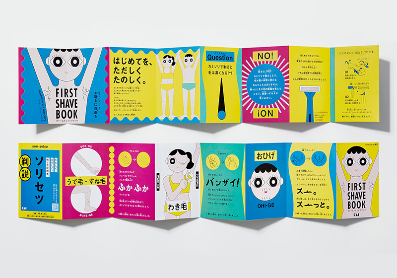 FIRST SHAVE BOOK™は、はじめてカミソリを使う人へ向けた剃り方説明書と今回のためにオリジナルデザインで開発した紙カミソリ®が付属された本。毛の剃り方だけではなく、「剃ると毛が濃くなる」「肌にブツブツができてしまう」などの間違った知識による毛の心配が少しでもなくなるように、武庫川女子大学薬学部教授の平尾哲二先生に監修いただき、わかりやすく解説しています。イラストレーターの瓜生太郎さんがイラストを制作し、剃り方や毛の知識を楽しく学べる、見やすくポップな本に仕上げました。