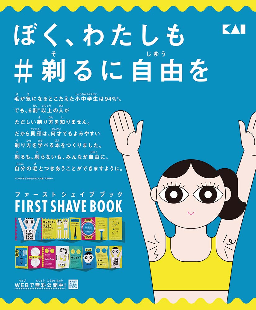刃物メーカーとして100年以上お客様に寄り添ってきた貝印は、剃毛・脱毛における意識の多様化に伴い、2020年8月から「#剃るに自由を™」をテーマにコミュニケーションを開始しました。そして今回は、毛の剃り方への理解、知識不足で悩む小中学生が、はじめてのカミソリを正しく楽しく使えるように、正しい剃り方や毛の知識を本にまとめたFIRST SHAVE BOOK™を開発いたしました。さらに、組み立てて使える紙カミソリ®付きです。貝印は今後も、正しい剃り方や毛の知識をもった上で、剃る・剃らないの自由な選択ができ、自分の毛と付き合うことができるよう、サポートをしてまいります。