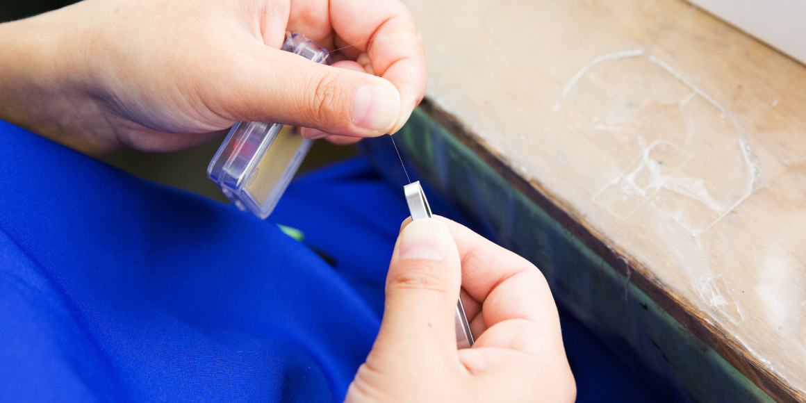 完成品を1本ずつ、検品していきます。人の毛に近い細さの釣り糸を使い、どの箇所からでも同じように毛をつかめるかを確認します。また、つかんだあとは引っ張り、毛が切れてしまわないかもチェック。