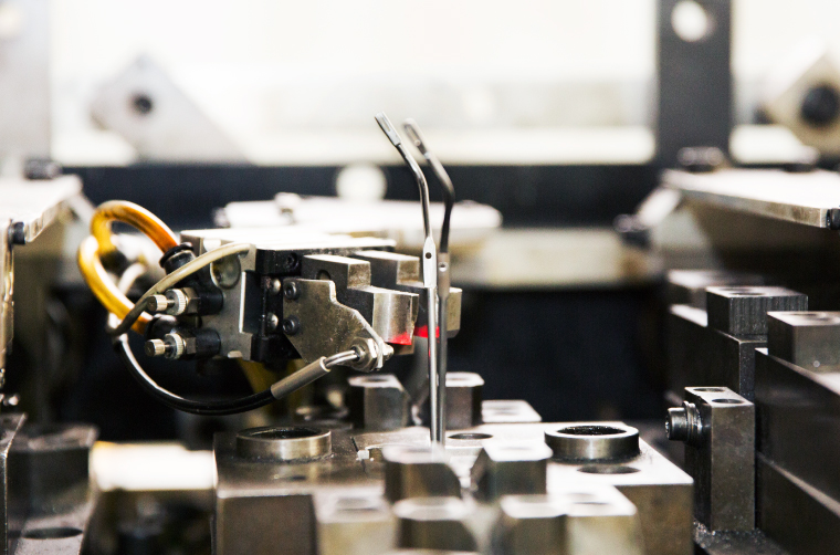 ひとつの機械で一気に曲げ、つぶし、穴開けを行い、ハンドルを作っていきます。
