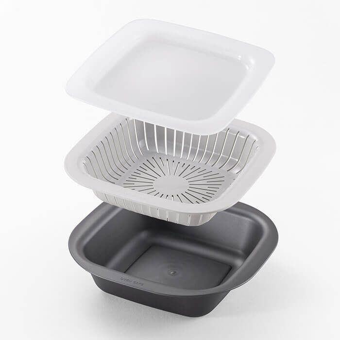 今回発売するのは、現代のライフスタイルに合わせ、調理作業の負担を減らして多様に活用できる調理容器、クッキングコンテナです。浅型(トレー)・コランダー※・深型(トレー)の3つのパーツを組み合わせて、下ごしらえから仕上げまで様々な調理作業ができ、すべてのパーツを電子レンジで使用できます。