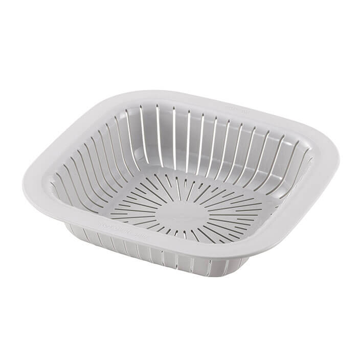 浅型(トレー)はバットや蓋として使え、コランダーは浅型(トレー)・深型と一緒に使い水切りをしながらレンジ加熱が可能です。深型(トレー)は、高耐熱性・低温特性に優れ、高強度・高剛性を兼ね備えた樹脂であるLCP樹脂(耐熱温度は250℃)を使用。電子レンジやオーブン(深型のみ)で使用が可能でオーブン調理にもご使用いただけます。