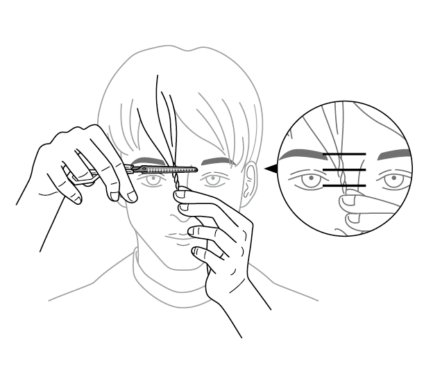 上(毛量の多い)の部分を真上に引き出してねじります。前髪と顔まわりの1~2cmはあまり切らないようにします。1回切ったら髪の毛を落とし、バランスを整えましょう。