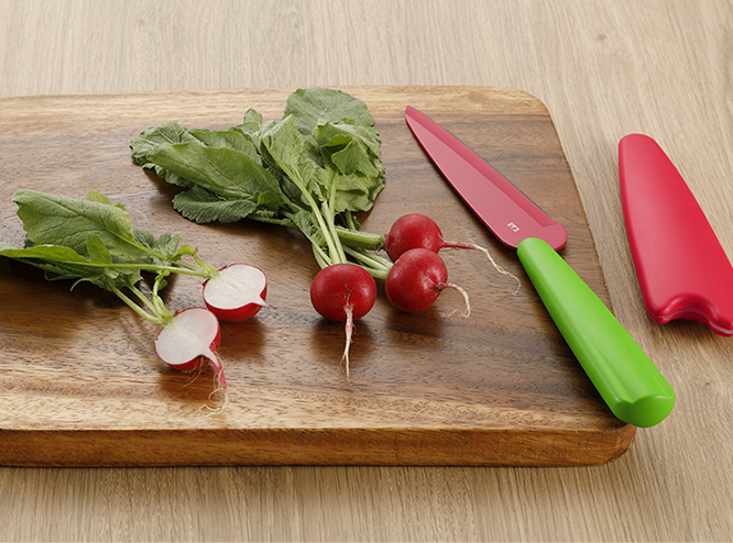 広州の開発部署で初めて包丁の商品設計を行ったのが、野菜をモチーフにしたベジタブルナイフ。根に見立てた刃体が特徴で、この刃体設計を担当した。サヤの構造や成形金型の構造などは、広州サイドから提案し、その一部が採用されたものだ。「サヤを着脱しやすく、しかし簡単にはずれない設計にするのに苦労した」と山内GMは言う。この商品は広東省内の協力メーカーで製造されているので、試作サンプルの確認や修正、量産へ向けての調整なども行った。