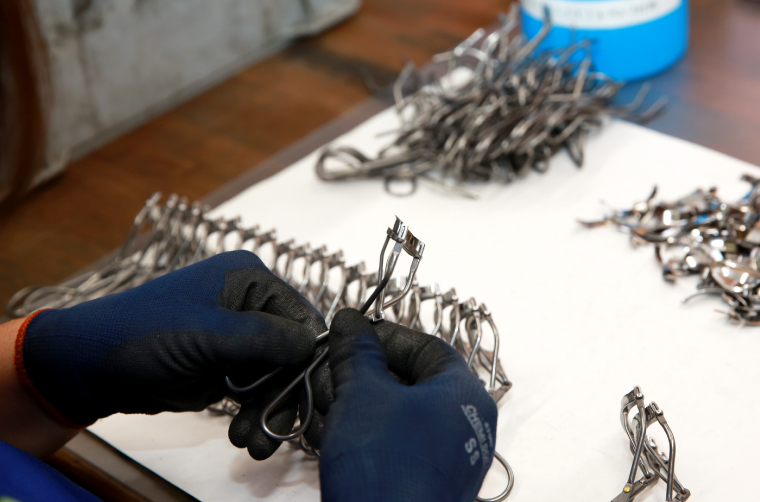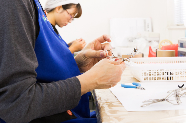 親指側と中指側のハンドルを合体させます(中指側のハンドルも、親指側と同じ機械で製作しています)。ほどよい締め具合にするための、重要な部分です。人の手で真鍮のビスを通し、締め具合をひとつひとつ調整していきます。
