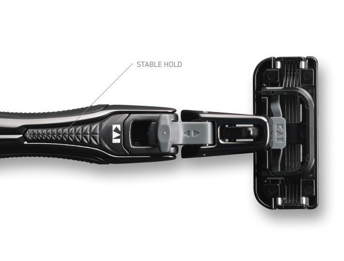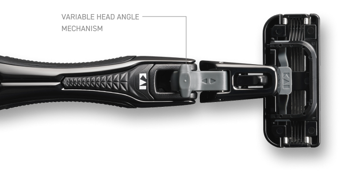 レバーを引くことでヘッドが30°可動する独自のヘッド角度可変機構により、手を持ち替えることなく逆剃りもしやすい。