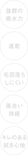 糸の中に空気を取り込む撚糸工法“スーパーゼロ”により、ボリューム感たっぷりの心地よい肌触りと、水分を瞬く間に吸い上げ、一度使うと忘れられない驚きの吸水力を実現。