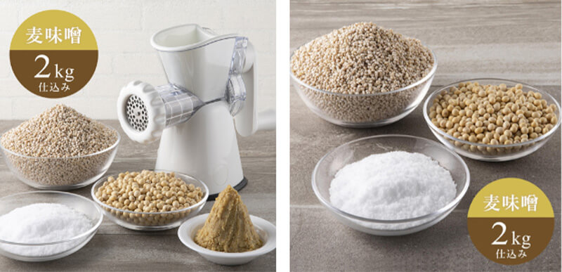 ミンサー付麦味噌セットと、原材料のみの味噌セット2kg仕込みの2種類をご用意しております。