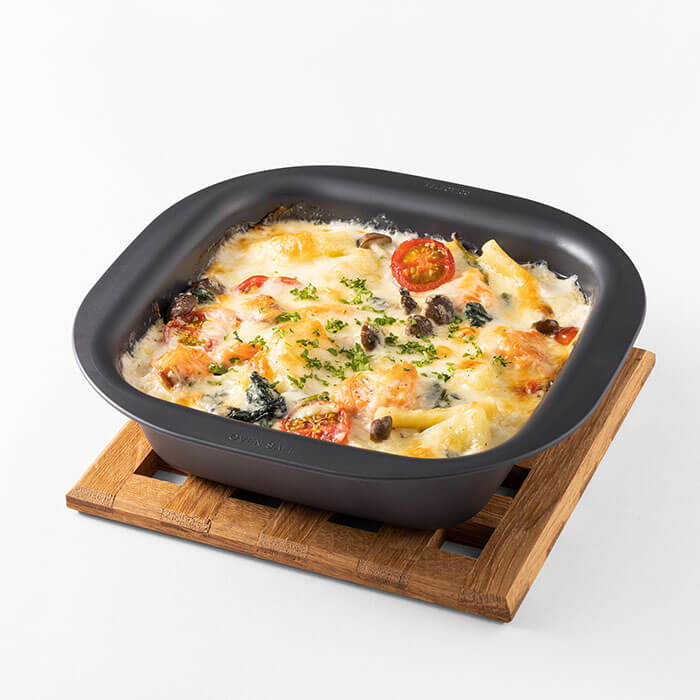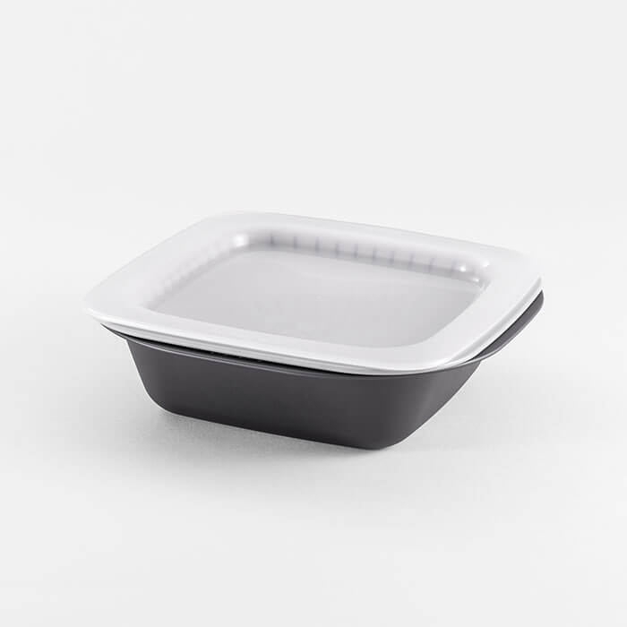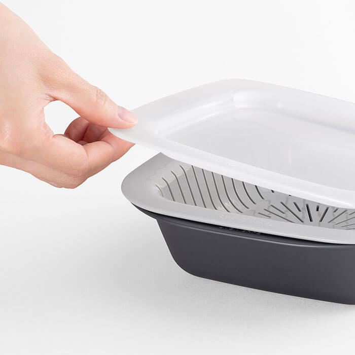 浅型(トレー)はバットや蓋として使え、コランダーは浅型(トレー)・深型と一緒に使い水切りをしながらレンジ加熱が可能です。深型(トレー)は、高耐熱性・低温特性に優れ、高強度・高剛性を兼ね備えた樹脂であるLCP樹脂(耐熱温度は250℃)を使用。電子レンジやオーブン(深型のみ)で使用が可能でオーブン調理にもご使用いただけます。