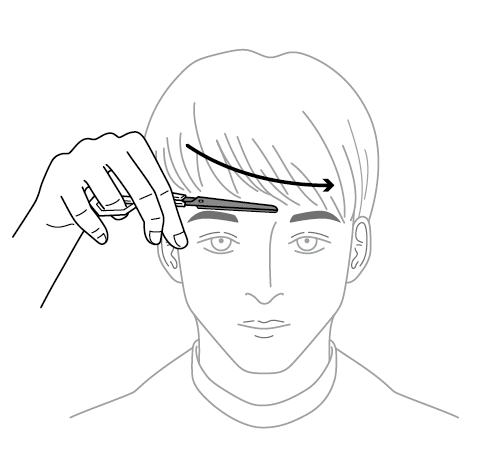 上(毛量の多い)の部分を真上に引き出してねじります。前髪と顔まわりの1~2cmはあまり切らないようにします。1回切ったら髪の毛を落とし、バランスを整えましょう。