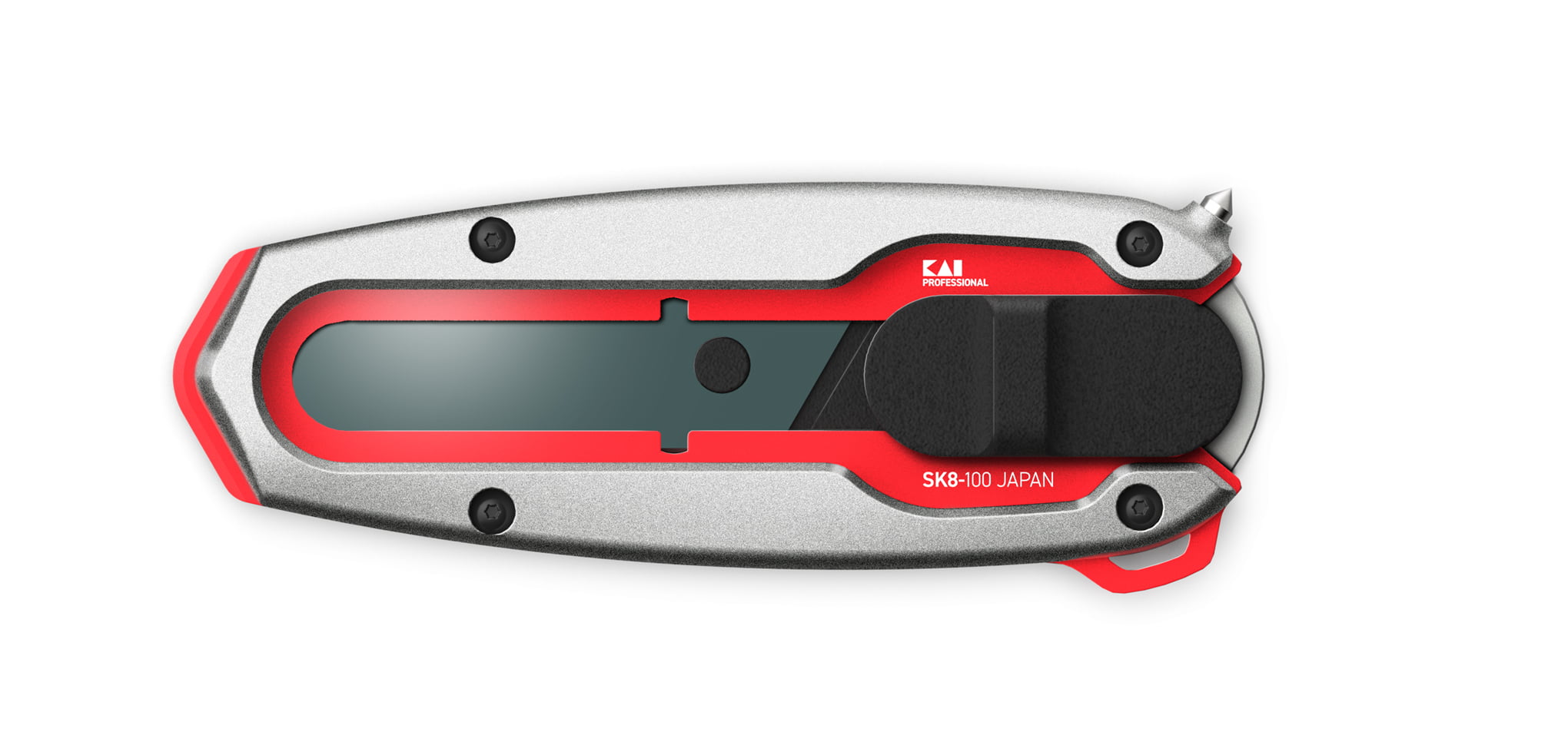デッキテープに適した鋭角刃のナイフにより、スムーズなカットを実現しました。スチール製の本体によって、テープを貼った際にデッキのエッジ出しを行うことができ、デッキテープにビス穴を開けるカーバイド製ニードルを配置し、トラックの交換までカバー。デッキテープ貼り替えの一連の工程を1ツールで完結します。カッターナイフにある「カチカチ」音を減らす事でチープさを最小化し、スケボー専用のナイフとしてその所作の品位を高めています。スケーターの所有欲を満たすタフな素材使いと、スポーティーなカラーリングでまとめました。